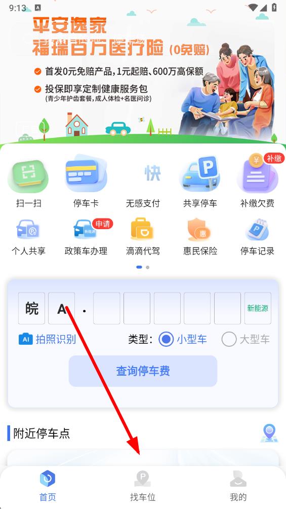 1、打开合肥停车APP,在首页找到并点击找车位按钮,进入找车位相关页面。