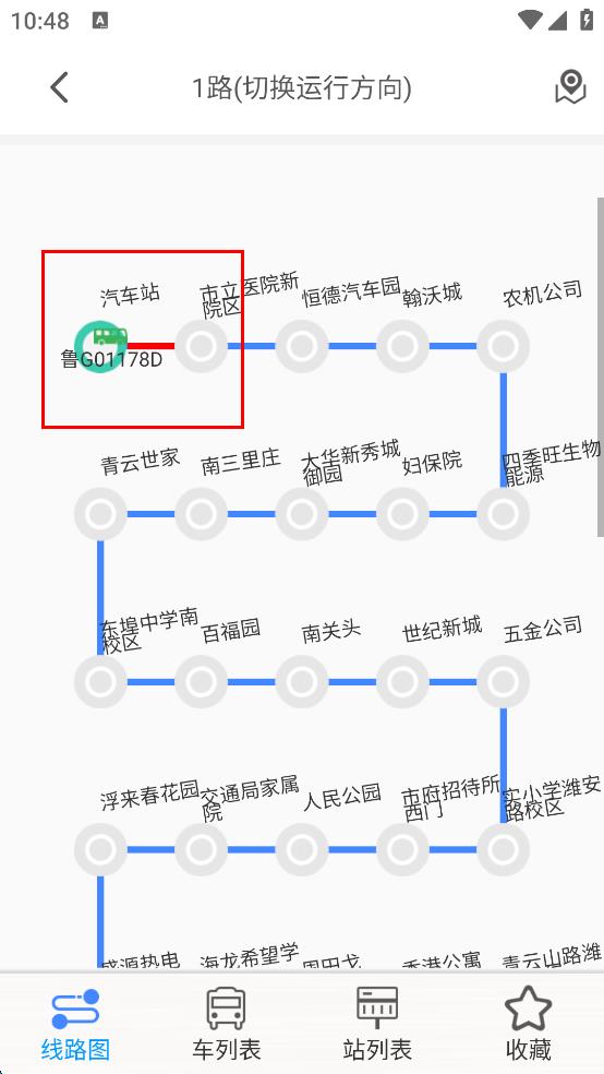 4、点击后进入到“1路”公交的线路图页面,可查看该线路的站点分布以及公交实时位置等信息,方便规划出行。