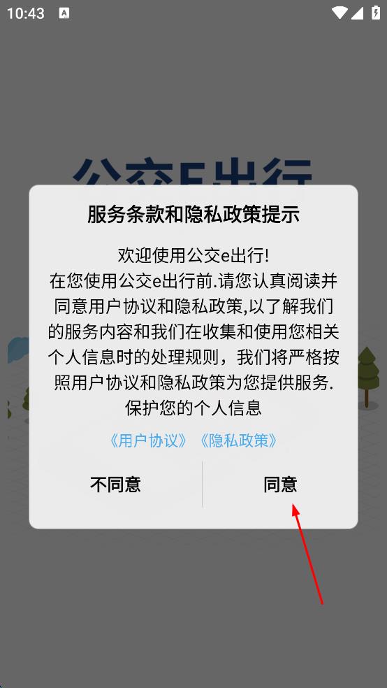 1、打开公交e出行应用,弹出“服务条款和隐私政策提示”框,认真阅读后点击“同意”,进入到应用主界面。