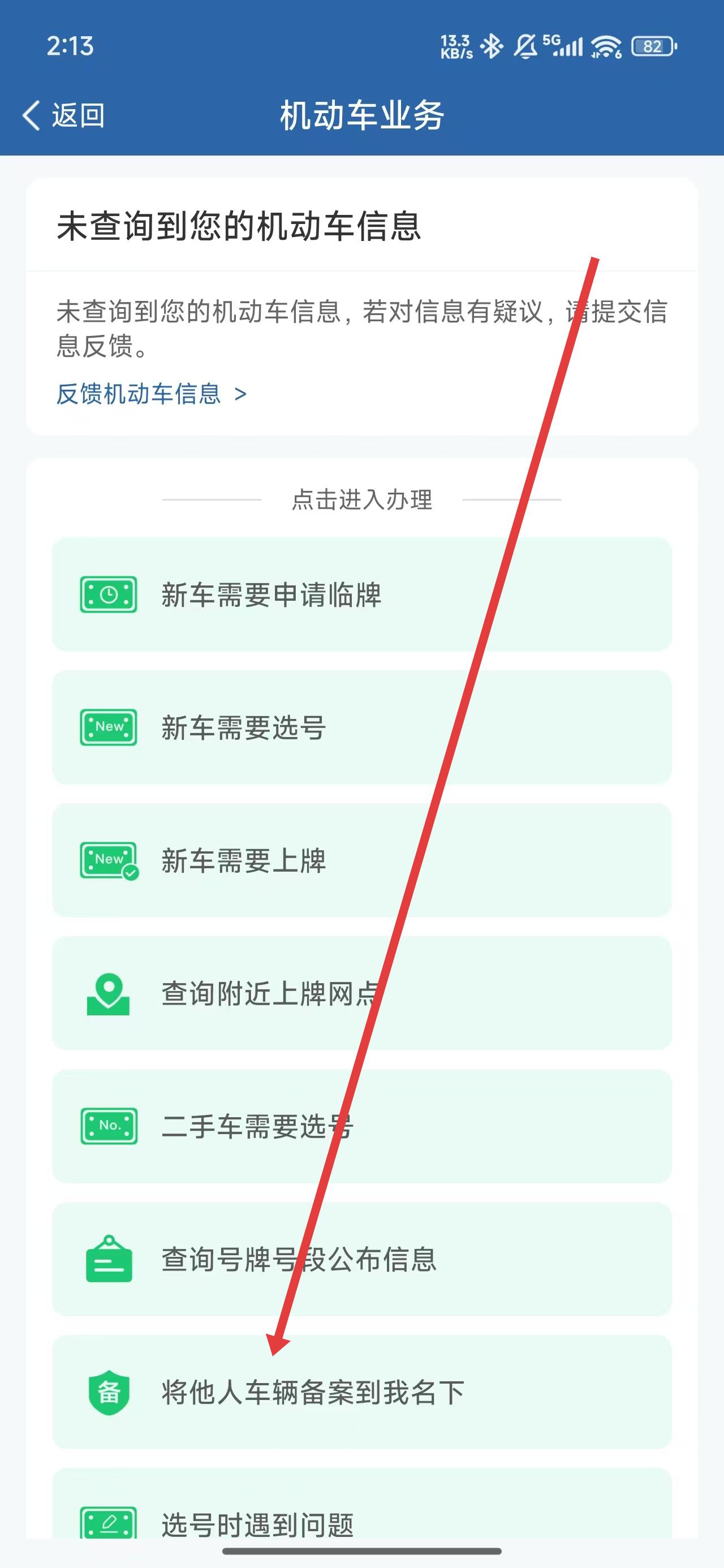 2、点击箭头指向业务选项,进入办理备案他人机动车业务。