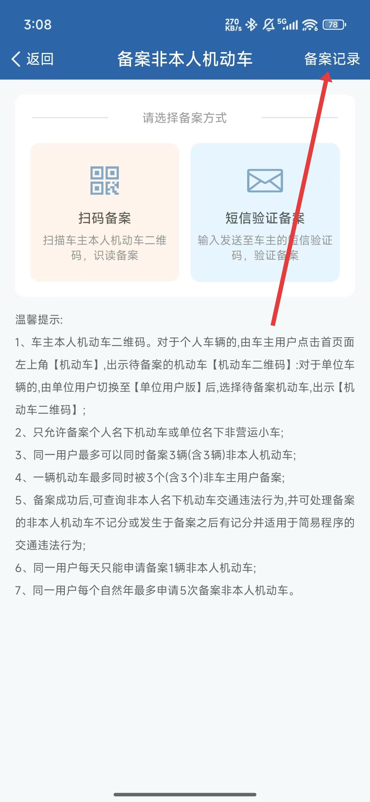 3、在进入到备案非本人机动车页面中,可以点击右上角备案记录查看备案信息。