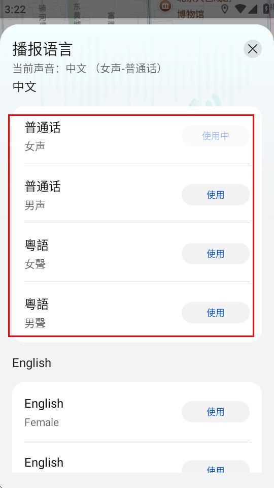 5、在播报语言页面,选择你想要的语音播报声音,点击使用即可完成更改。