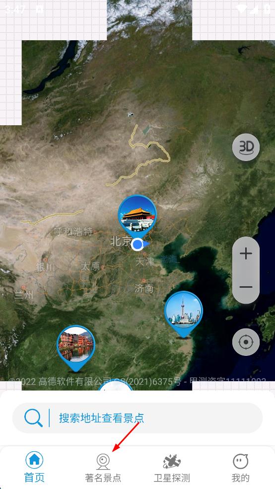 1、打开地图类APP,进入首页后,点击底部导航栏中的“著名景点”选项,进入著名景点相关页面。