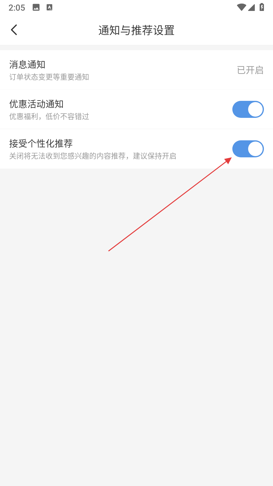 4、在通知与推荐设置页面,找到接受个性化推荐的开关,点击该开关将其关闭。