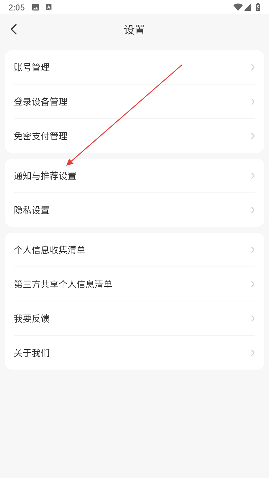 3、在设置界面里,点击通知与推荐设置选项,进入对应页面。