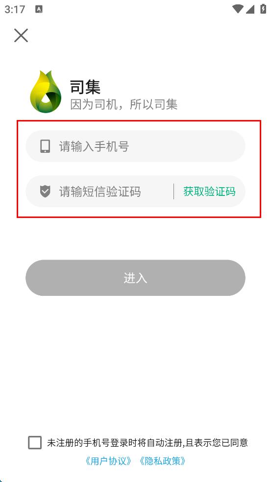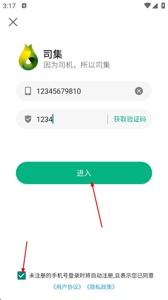 4、勾选未注册的手机号登录将自动注册,且表示您已同意用户协议,隐私政策,然后点击“进入”按钮。