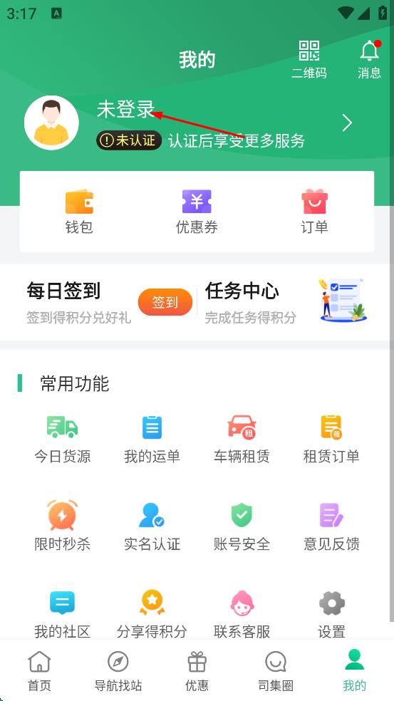 2、在“我的”页面,点击“未登录”区域。