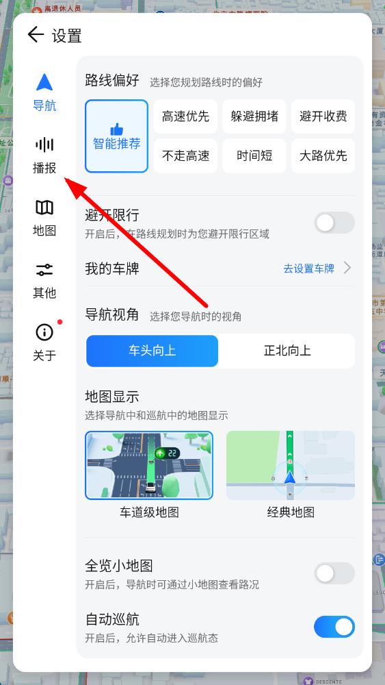 2、在设置页面的左侧菜单栏中,点击播报选项,进入播报设置界面。