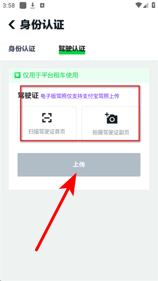 4、进入驾驶认证页面后,选择上传方式获取驾照信息,随后完成上传操作即可。
