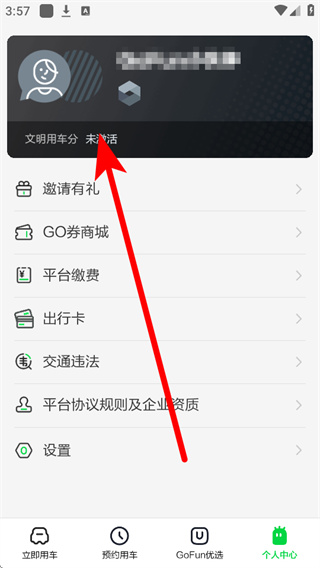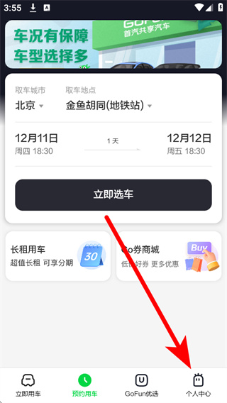 1、打开GoFun出行,点击底部导航栏的个人中心,进入个人中心页面。