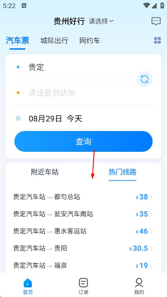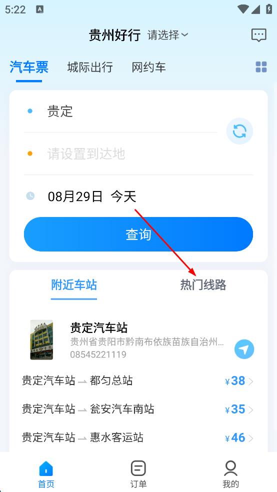 3、设置好到达地后,点击查询按钮,查看相关汽车票信息,也可点击“热门线路”,查看贵定汽车站到都匀总站、热门线路的车票价格。