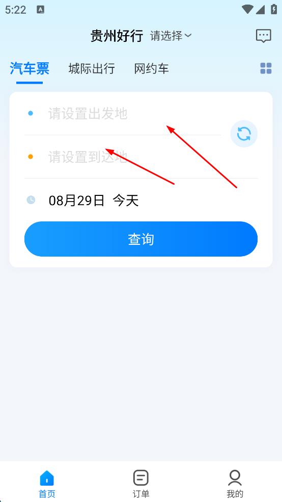 1、打开贵州好行应用,进入首页后,在“汽车票”板块下,点击“请设置出发地”输入框,选择出发地(如贵定)。