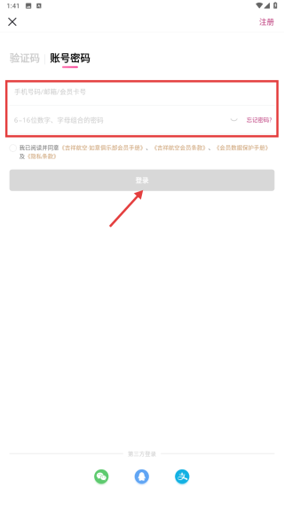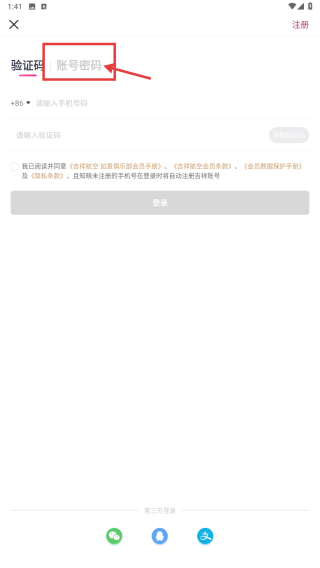 3、在登录界面,选择账号密码登录方式,输入账号和密码。