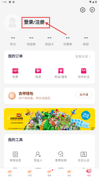 2、在个人中心,点击登录/注册区域,进入登录选择界面。