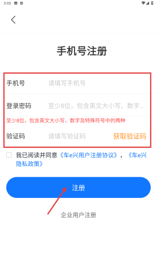 4、在注册页面,输入手机号、登录密码并获取验证码,勾选用户协议后点击注册按钮,完成账号注册操作。