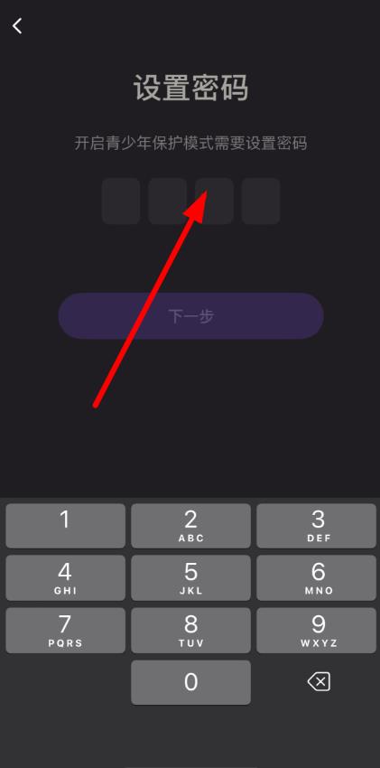 3、在弹出的设置密码界面,按照要求设置密码,输入完成后点击下一步,即可成功开启青少年模式。