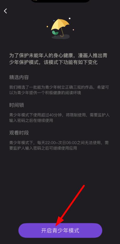 2、进入青少年模式介绍页面后,仔细阅读相关说明,确认后点击下方的开启青少年模式按钮。