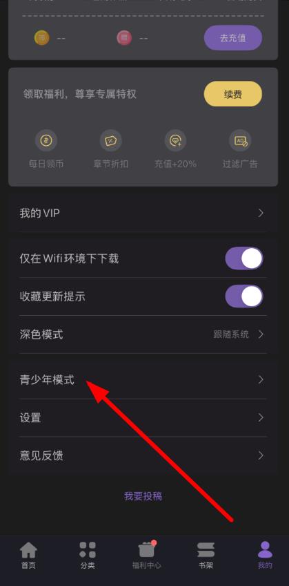 1、打开漫画岛APP,点击底部导航栏中的我的选项,进入个人中心页面,在页面中找到青少年模式选项并点击。