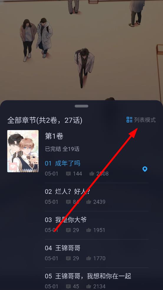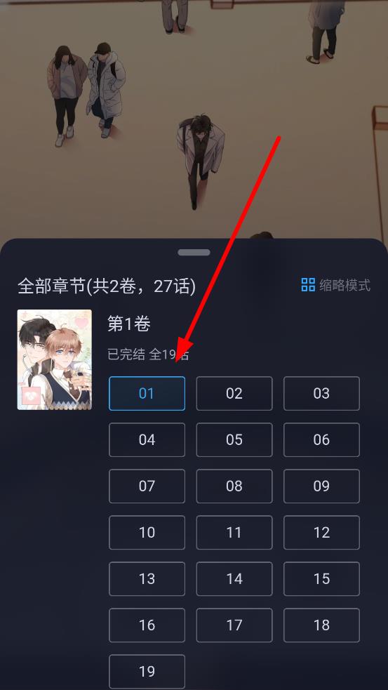 3、点击后,会弹出模式选择菜单,选择缩略模式,此时目录会切换成缩略模式展示,方便快速浏览和选择漫画章节。