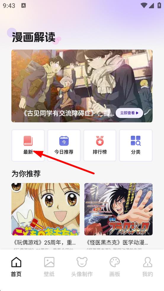 1、在首页,点击最新,进入最新漫画解读列表页面。