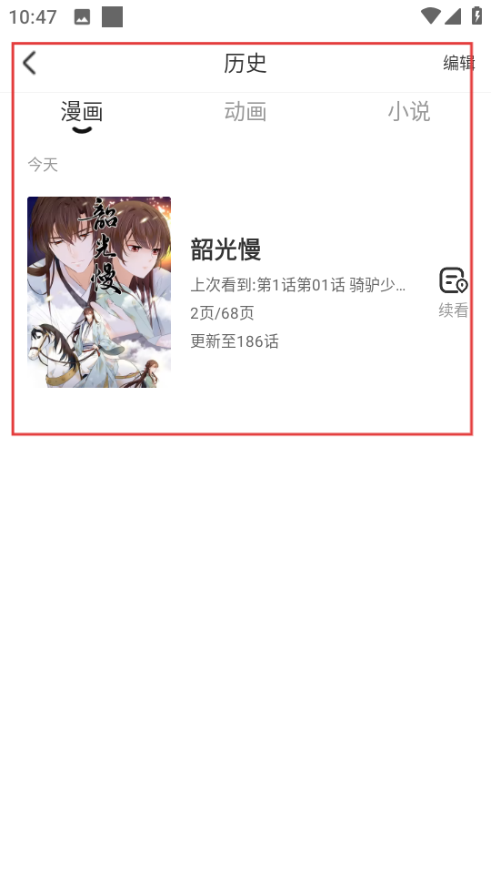 3、在历史记录页面,可查看之前看过的漫画等内容,方便续看。