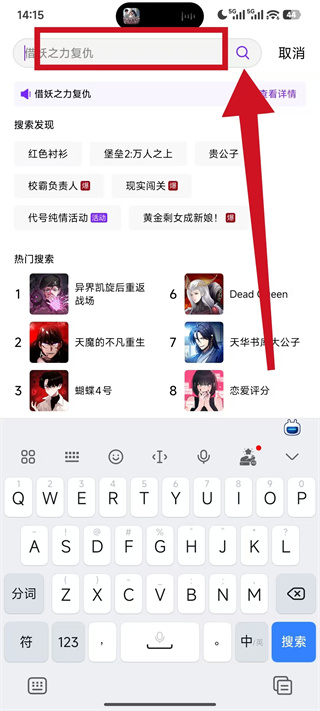 3、在搜索界面里输入目标名字,点击对应的漫画,进入该漫画的详情页面。