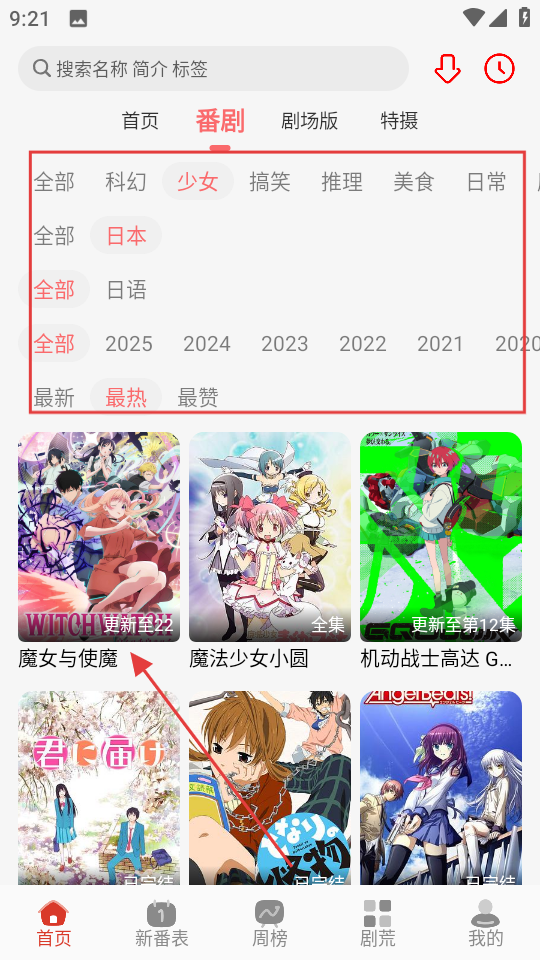 2、在番剧筛选页面,筛选想看的条件,找到魔女与使魔,进入该剧集页面。