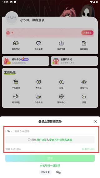 3、输入手机号码,勾选同意用户协议和爱奇艺隐私政策,点击获取验证码,输入收到的验证码后登录。