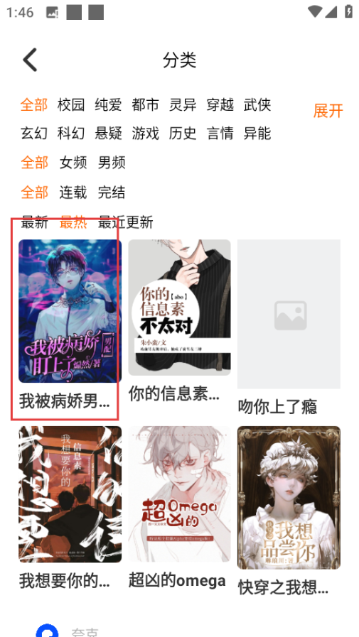 3、在分类页面,筛选喜欢的小说,比如我被病娇男配盯上了,进入小说详情页。