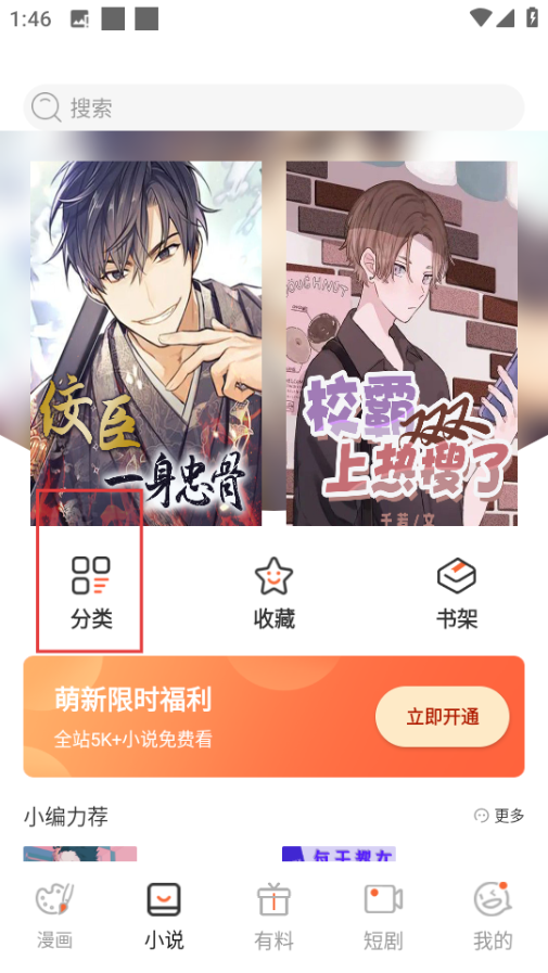 2、在小说页面,点击分类按钮,进入分类页面。