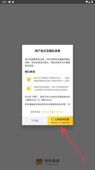 1、打开奇热漫画APP,进入时会弹出用户协议及隐私条款,点击已阅读并同意的按钮。
