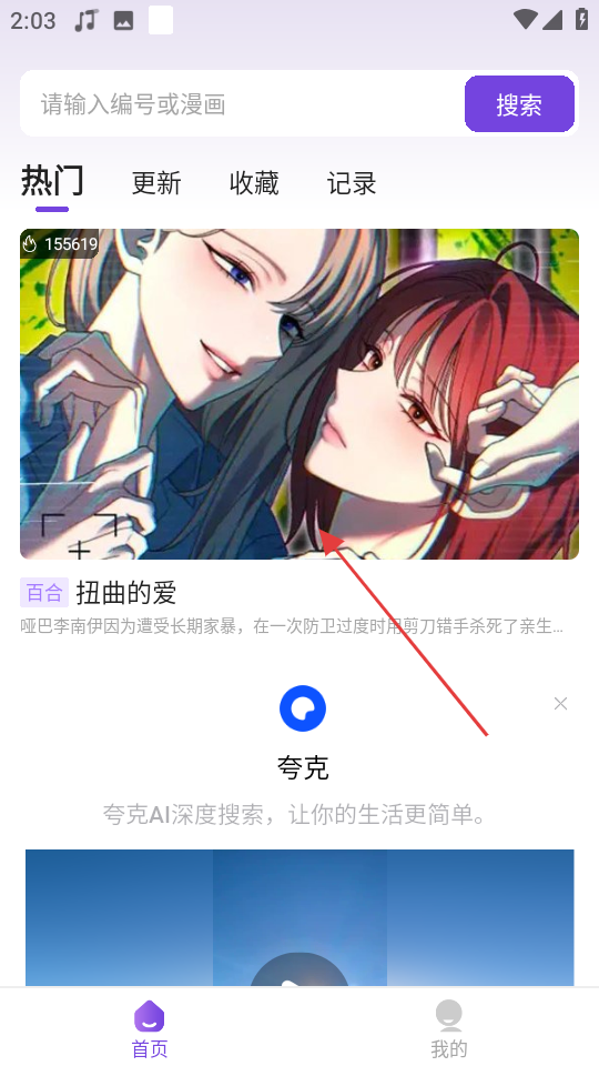 1、在首页热门漫画中,点击扭曲的爱漫画封面,进入该漫画详情页。