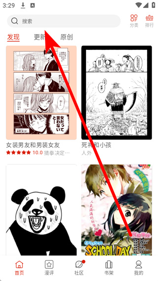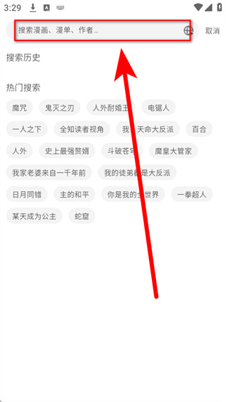 1、打开vomic漫画,在首页点击顶部的搜索框,进入搜索页面。