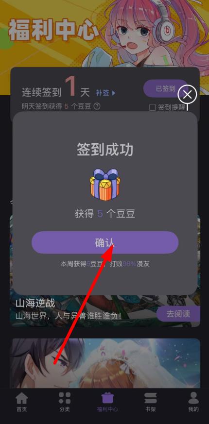 3、签到成功后,会弹出提示框显示获得的福利,比如获得5个豆豆,点击确认按钮,即可完成福利领取,后续也可在该页面查看其他福利活动。