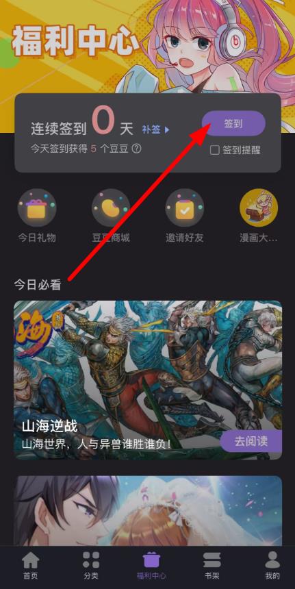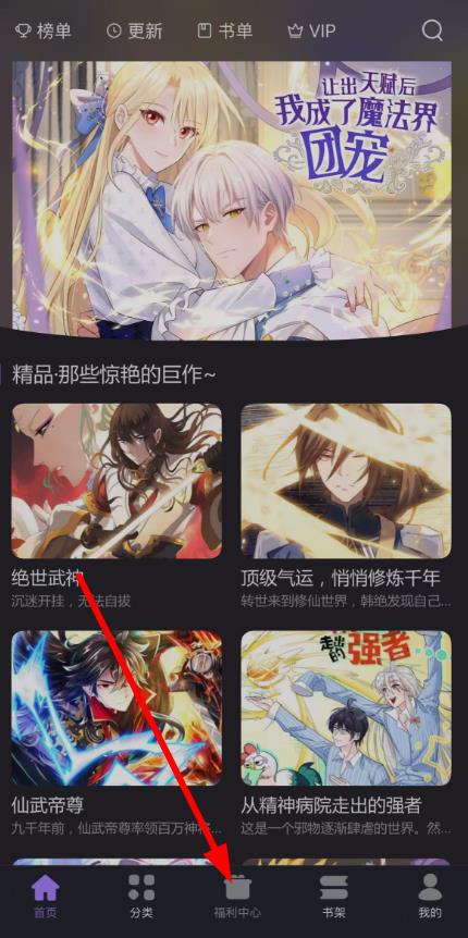 1、打开漫画岛APP,进入首页,点击底部导航栏中的福利中心选项,进入福利中心页面。