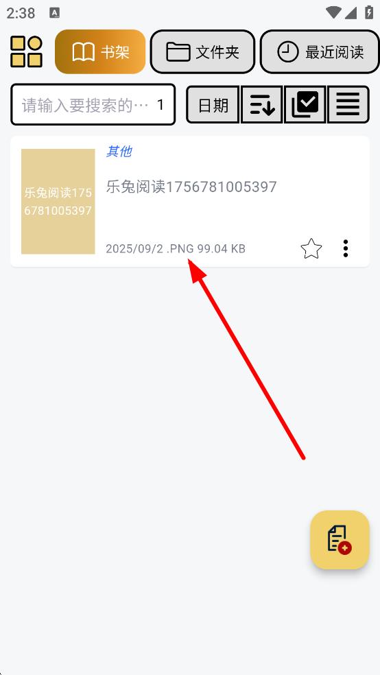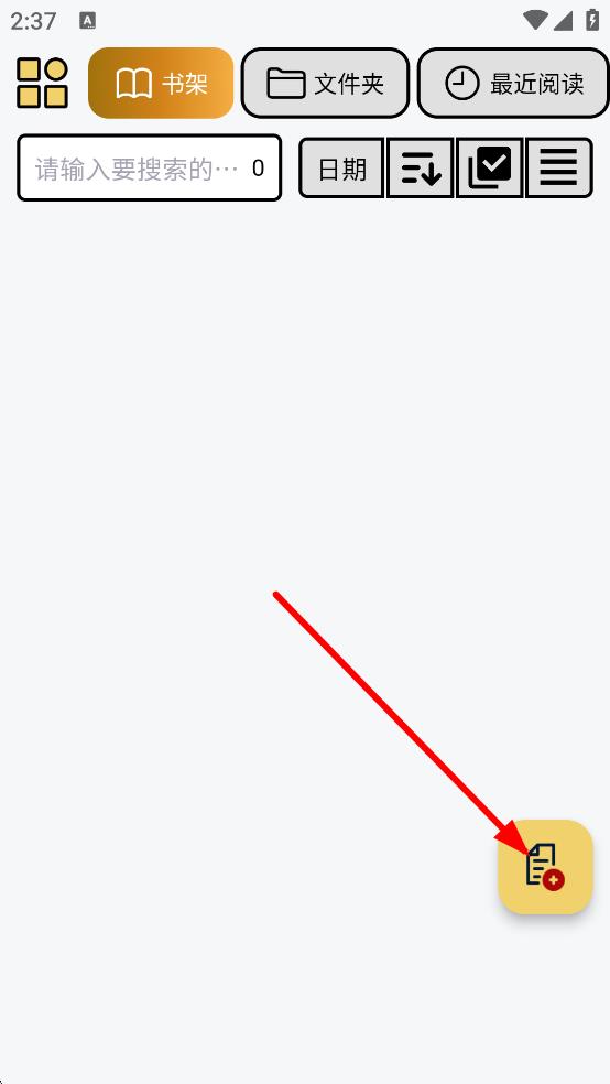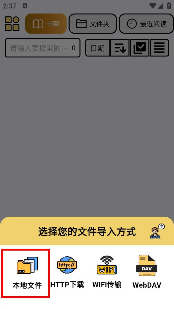 1、在书架页面,点击右下角带加号的文件图标,弹出文件导入方式选择框。