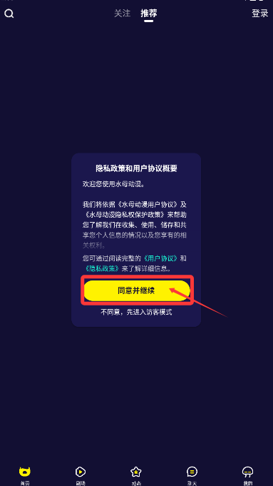 1、初次启动应用时,请仔细阅读平台使用条款,确认后点击"同意进入"。