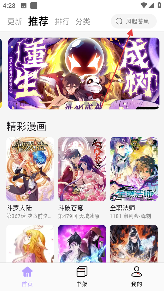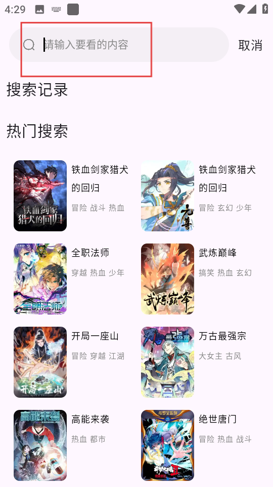 1、在漫画类应用首页,点击顶部搜索框,进入搜索页面。
