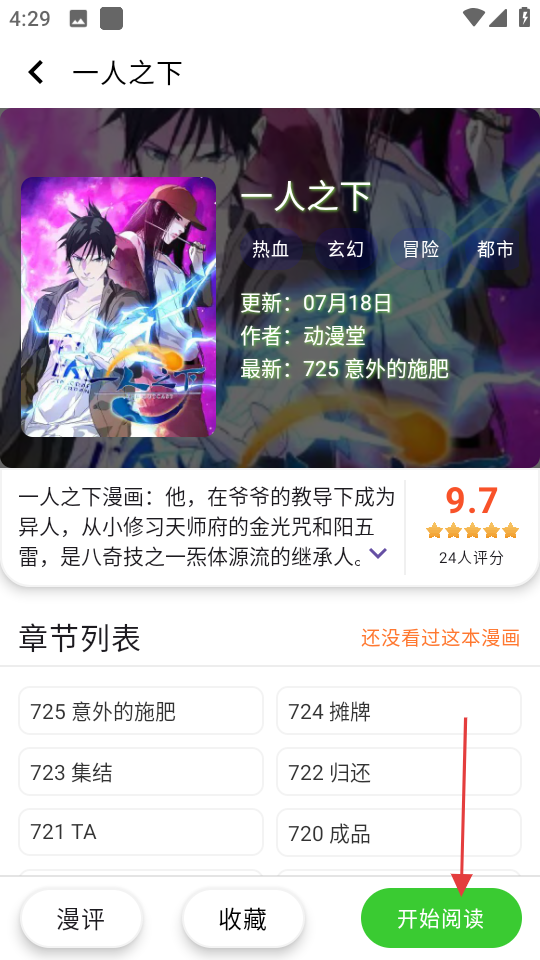 4、在详情页面,点击开始阅读,即可阅读一人之下漫画内容。