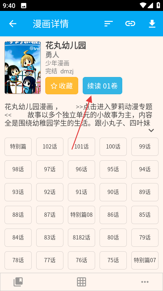 4、进入漫画详情页后,若要继续阅读,点击续读01卷按钮即可。