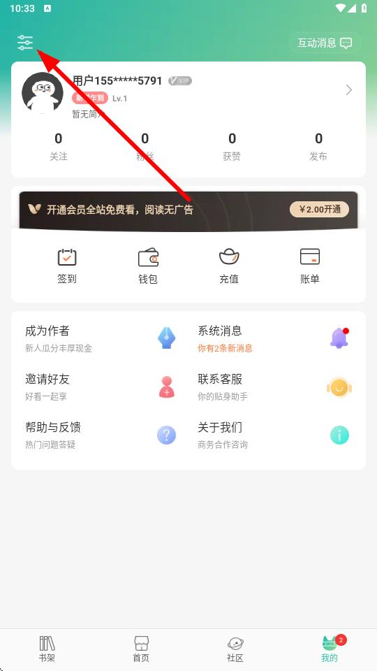 2、在个人页面左上角找到设置图标,并点击进入设置界面。