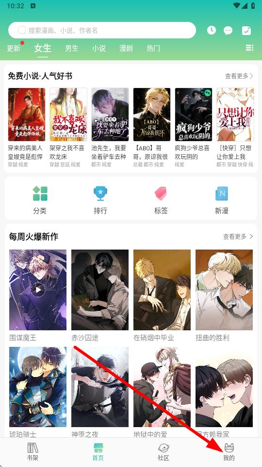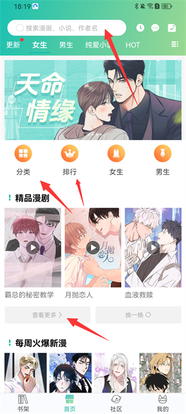 1、首先进入软件首页,首页就有着丰富的漫画资源,以及不同的漫画分类,最简单的方式就是直接点击上方的搜索框,属兔麻花、小说、作者等进行搜索,也可以直接通过软件精选推荐去查找感兴趣的漫画内容,点击“查看更多”还有更加丰富的漫画资源;