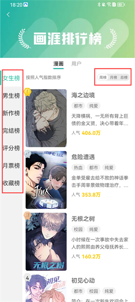 3、在【排行】板块可以看到各个不同榜单的漫画排行,可以选择切换周榜/月榜/总榜进行选择,不知道看什么,点击排行榜,看大家都在看什么,跟着走准没错;