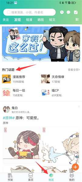 4、点击【社区】板块,有超多漫友在线分享自己喜欢的漫画以及追漫感想等,还有丰富的热门话题等着大家参与讨论。