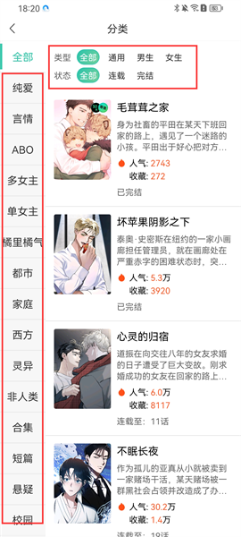 2、在【分类】板块,将所有的漫画根据不同的题材类型以及更新状态进行细致划分,便于用户快速筛选;