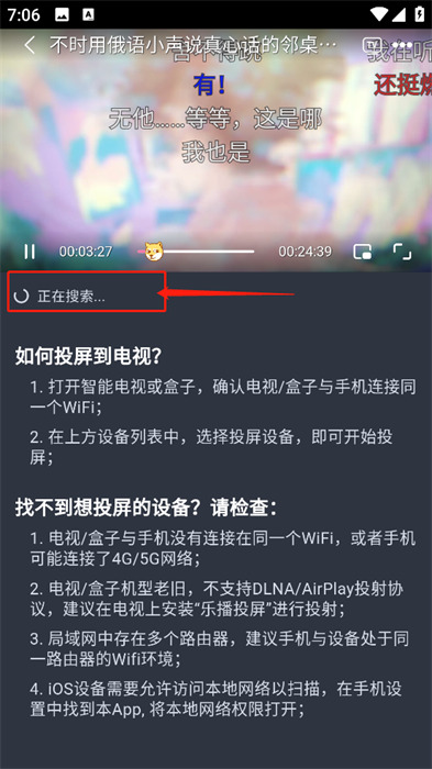4、最后,你能看到正在搜索周围设备的页面,并且下方还有一些常见问题的描述,如果是同时连接同一个无线网络一定能顺利投屏。