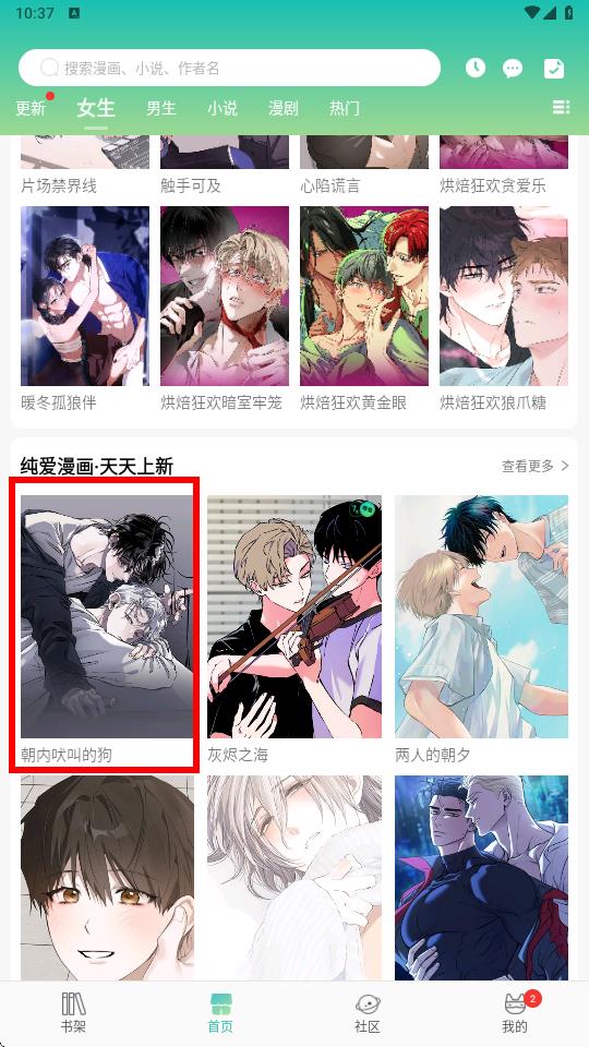 1、通过本站下载安装好软件后,点击进入松首页,在首页我们能够看见丰富的漫画资源,以及分类/排行/女生/男生等划分,方便大家快速找到喜欢的漫画;
