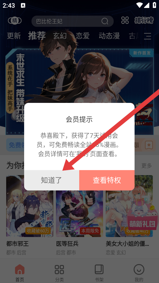 3、登录后会弹出会员提示弹窗,点击知道了即可确认领取免费会员,也可查看特权了解会员可享的具体权益。
