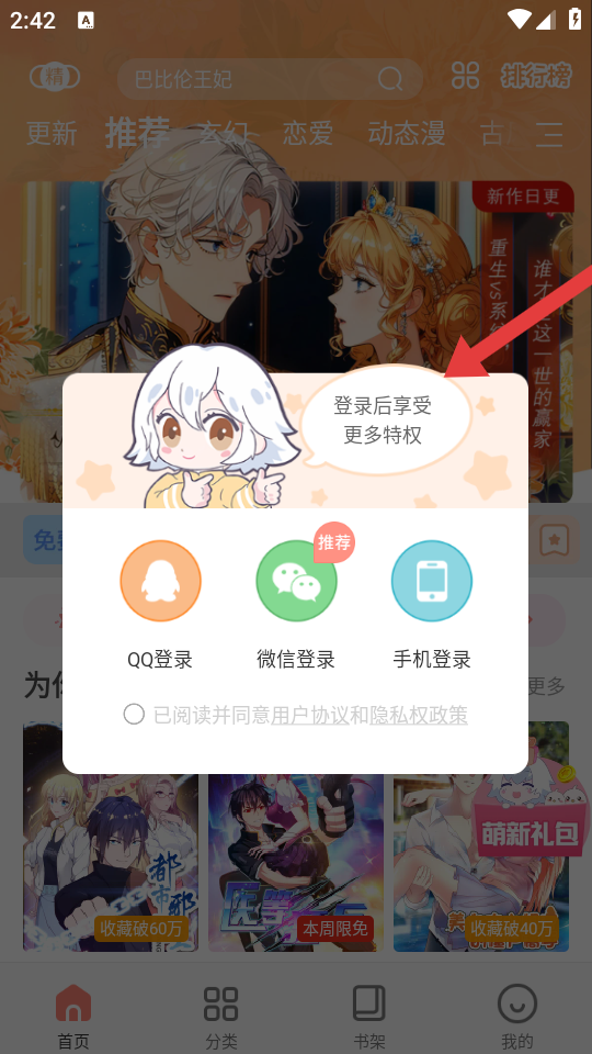 2、在弹出的登录界面,选择任意一种登录方式,勾选已阅读并同意用户协议和隐私权政策,完成登录操作。