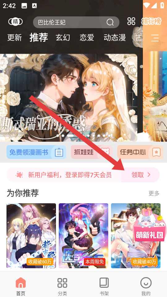 1、打开飒漫画APP找到新用户福利,登录即得会员的领取入口,点击领取这是开启会员领取流程的关键一步。